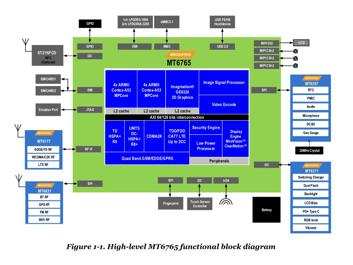 With integrated Bluetooth, FM, WLAN and GPS modules, the MT6765 is a highly integrated baseband platform including modem and application processing subsystems, enabling LTE/LTE-A and C2K smartphone applications. The chip integrates an ARM Cortex-A53 operating system up to 2.3GHz and a powerful multi-standard video codec. In addition, a wide set of interfaces for connecting peripherals include interfaces to cameras, touchscreen displays and MMC/SD cards.